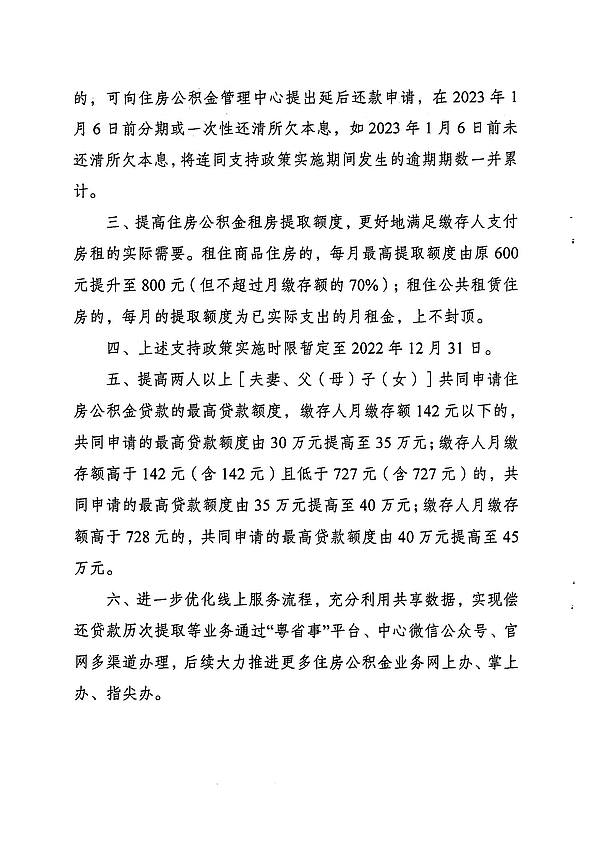 陽江市住房公積金管理委員會(huì)關(guān)于我市實(shí)施住房公積金階段性支持政策的通知 為貫徹落實(shí)黨中央、國務(wù)院關(guān)于高效統(tǒng)籌疫情防控和經(jīng)濟(jì)社會(huì)發(fā)展的決策部署,進(jìn)一步加大住房公積金助企紓困力度,幫助受疫情影響的企業(yè)和繳存人共同渡過難關(guān),根據(jù)住房和城鄉(xiāng)建設(shè)部財(cái)政部人民銀行《關(guān)于實(shí)施住房公積金階段性支持政策的通知》(建金〔2022〕45號(hào))精神,現(xiàn)就我市實(shí)施住房公積金階段性支持政策通知如下: 各繳存單位、繳存人: 為貫徹落實(shí)黨中央、國務(wù)院關(guān)于高效統(tǒng)籌疫情防控和經(jīng)濟(jì)社會(huì)發(fā)展的決策部署,進(jìn)一步加大住房公積金助企紓困力度,幫助受疫情影響的企業(yè)和繳存人共同渡過難關(guān),根據(jù)住房和城鄉(xiāng)建設(shè)部財(cái)政部人民銀行《關(guān)于實(shí)施住房公積金階段性支持政策的通知》(建金〔2022〕45號(hào))精神,現(xiàn)就我市實(shí)施住房公積金階段性支持政策通知如下: 一、受新冠肺炎疫情影響的企業(yè),可按規(guī)定申請(qǐng)緩繳住房公積金,到期后進(jìn)行補(bǔ)繳。在此期間,繳存職工正常提取和申請(qǐng)住房公積金貸款,不受緩繳影響。 二、受新冠肺炎疫情影響的繳存人,不能正常償還住房公積金貸款的,不作逾期處理,不計(jì)收罰息,不作為逾期記錄報(bào)送征信部門。預(yù)計(jì)2022年12月31日前不能按期正常償還貸款本息的,可向住房公積金管理中心提出延后還款申請(qǐng),在2023年1月6日前分期或一次性還清所欠本息,如2023年1月6日前未還清所欠本息,將連同支持政策實(shí)施期間發(fā)生的逾期期數(shù)一并累計(jì)。 三、提高住房公積金租房提取額度,更好地滿足繳存人支付房租的實(shí)際需要。租住商品住房的,每月最高提取額度由原600元提升至800元(但不超過月繳存額的70%);租住公共租賃住房的,每月的提取額度為已實(shí)際支出的月租金,上不封頂。 四、上述支持政策實(shí)施時(shí)限暫定至2022年12月31日。 五、提高兩人以上[夫妻、父(母)子(女)]共同申請(qǐng)住房公積金貸款的最高貸款額度,繳存人月繳存額142元以下的,共同申請(qǐng)的最高貸款額度由30萬元提高至35萬元;繳存人月繳存額高于142元(含142元)且低于727元(含727元)的,共同申請(qǐng)的最高貸款額度由35萬元提高至40萬元;繳存人月繳存額高于728元的,共同申請(qǐng)的最高貸款額度由40萬元提高至45萬元。 六、進(jìn)一步優(yōu)化線上服務(wù)流程,充分利用共享數(shù)據(jù),實(shí)現(xiàn)償還貸款歷次提取等業(yè)務(wù)通過“粵省事”平臺(tái)、中心微信公眾號(hào)、官網(wǎng)多渠道辦理,后續(xù)大力推進(jìn)更多住房公積金業(yè)務(wù)網(wǎng)上辦、掌上辦、指尖辦。 陽江市住房公積金管理委員會(huì) 2022年6月8日