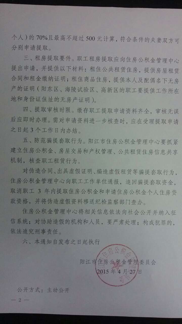 陽江市住房公積金管理委員會關(guān)于放寬提取住房公積金支付房租條件的通知